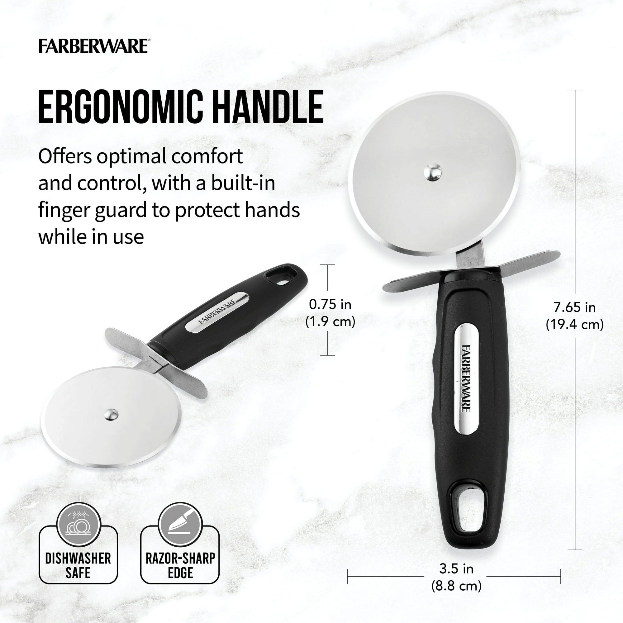 The Professional Stainless Steel Pizza Cutter cuts through pizza, pie crust, and pastry dough with ease. The super-sharp wheel features a nonstick coating that prevents food from being left behind on blade for easy cleaning. The ergonomic handle provides optimal comfort and control, and features a finger guard to protect hands while in use. Durable and strong, the rust-resistant stainless steel construction stands up to everyday use. Dishwasher safe. Lifetime Limited Warranty.